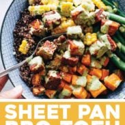 Ideas for bowl assembly: quinoa, rice, roasted sweet potatoes, green beans, corn, zucchini, tomatoes, mushrooms, spicy coleslaw (I just toss a bag of preshredded cabbage coleslaw mix with a little bit of mayo, salt, and Sriracha. Vegan mayo works, too!)