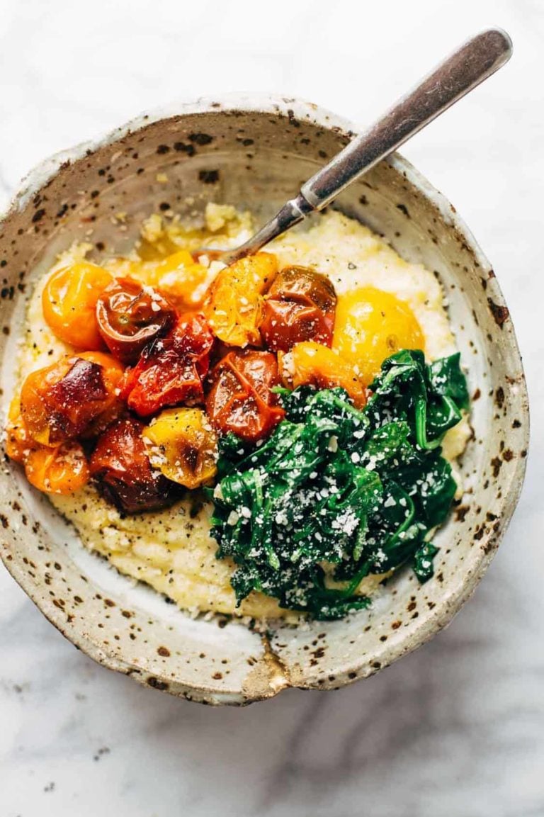 Fresh, juicy tomatoes, vibrant green spinach, and a creamy goat cheese polenta!