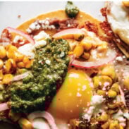 The fried egg is just your standard cheese-skirt fried egg (which is really having a moment right now!) but we’re going elote-style with the whole thing – adding some roasted corn, cotija, and cilantro – and finishing with a tangle of pickled red onions and a happy little thwap of green sauce.