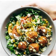 Source notes: This recipe was previously titled “Summer Bliss Bowls with Sweet Potato Falafel and Jalapeño Ranch” but was updated in August 2021 to better reflect and respect the cultural origins from which falafel came from. Falafel is a traditional Middle Eastern food that’s typically made from chickpeas, fava beans, or both, and is fried into a ball or fritter shape. Check out this recipe from Suzy at The Mediterranean Dish to make traditional falafel, step by step!